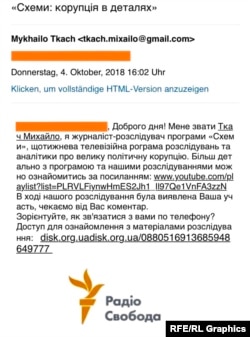 Шахраї, як повідомляє редакція «Схем», створили «цифрового двійника» Михайла Ткача: електронну адресу з його ім’ям, прізвищем та фото, а також використали у підписі журналіста логотип редакції Радіо Свобода. Сам текст листа імітує запит на коментар, які в такій формі ніколи не розсилалися ані від імені «Схем», ані від імені авторів-розслідувачів програми.