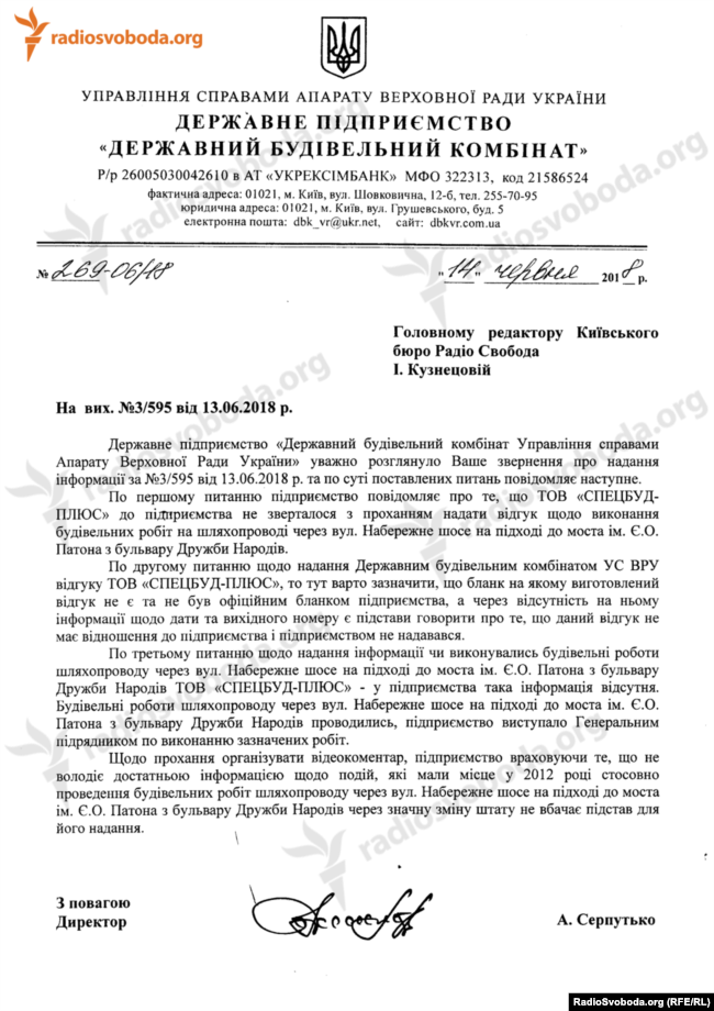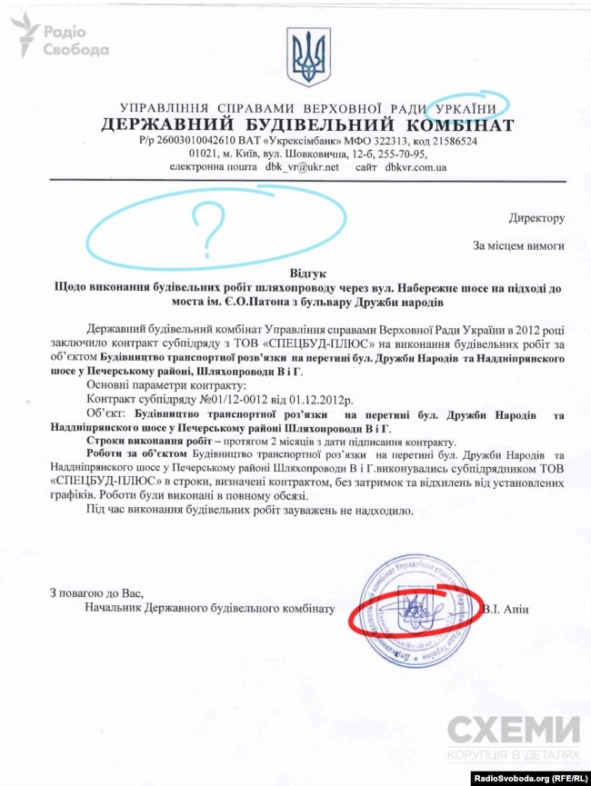 Однак у документі не вказана дата складання відгуку та стоїть підпис директора, який звільнився ще чотири роки тому. У «шапці» також неправильно написали слово «Україна». Державний будівельний комбінат Верховної Ради офіційно підтвердив «Схемам», що не надавав такого відгуку. А про те, що компанія «Спецбуд-Плюс» виконувала якісь роботи на Набережному шосе на комбінаті відповіли, що вперше чують.