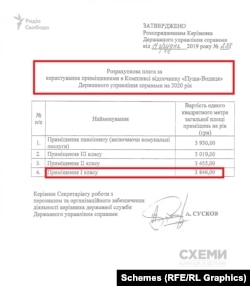 Вартість оренди одного квадратного метра у приміщеннях найвищого класу у комплексі складає майже 320 гривень на місяць. Державна резиденція, де оселилася Венедіктова, не лише належить до найбільш облаштованих приміщень на території, а й має статус державної резиденції. Як встановили «Схеми», квадратний метр оренди, судячи з укладеного контракту, коштує Венедіктовій майже 95 гривень на місяць.