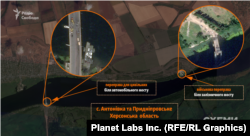 Супутник Planet Labs зафіксував, що російські військові почали використовувати окрему поромну переправу для переміщення техніки через Дніпро неподалік окупованого Херсону. Знімки, що це підтверджують, є у розпорядженні «Схем» (Радіо Свобода). Це вже друга переправа, яку побудували окупанти після точних ударів Збройних сил України по Антонівському автомобільному та залізничному мостах. Як повідомляла раніше британська розвідка, російські війська побудували біля Херсону два понтонні мости і обладнали поромну переправу, щоб компенсувати пошкодження цих мостів.