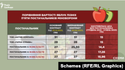 Наприклад, фірма «Актив Компані» залишила в оновленому контракті для армії ціну на яблука на рівні 51 гривня за кілограм, і вже почала постачати їх у військові частини саме по такій ціні, що підтверджується видатковою накладною, оприлюдненою журналісткою Тетяною Ніколаєнко. При цьому, проаналізувавши закриті фінансово-податкові звіти компанії «Схеми» з’ясували, що закупівельна ціна на яблука протягом листопада-лютого для цієї компанії становила всього 15 гривень за кіло. Тобто націнка для війська на яблука, виходить, більша ніж утричі.