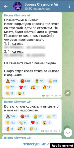 Журналісти Радіо Свобода виявили щонайменше два таких Telegram-канали. Один із них має назву Booms Claymore Air. Замовники, зокрема, пропонують 5 доларів за «наліпку на будинку», 25 доларів за те, щоб світити ліхтарем з вікна у визначений день та час і 10 доларів за те, щоб залишити невелику коробку на місцевості «площею не менше ніж десять на десять метрів».