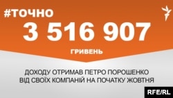 Президент України Петро Порошенко у жовтні отримав 3 516 907 гривень доходу. Така інформація міститься в Єдиному державному реєстрі декларацій осіб, уповноважених на виконання функцій держави або місцевого самоврядування, повідомляє #Точно, проект Радіо Свобода.