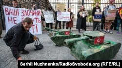 Також біля посольства встановили два картонні макети танка, що символізують військову операцію Туреччини в Сирії.