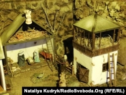 На передньому плані можна розгледіти карпатські ялини, синє озеро й отару овець біля нього. А на другому – подвір’я і хатина з села Многопілля Донецької області. Саме там до початку війни на сході жила схимонахиня Теодозія. Її вертеп символічно відображає дух українського Різдва від заходу до сходу і частково знайомить глядачів із українською різдвяною традицією, повідомляє кореспондент Радіо Свобода.