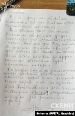 «9.03.2022. В 11:22 відбулось аварійне відключення ВЛ-750 Київська-ЧАЕС (єдине джерело). Всі об’єкти ЧАЕС знеструмленні, увімкнені аварійні дизельні генератори для електропостачання тільки систем, важливих для безпеки. Дизельного пального вистачає для роботи дизельного генератора тільки на 48 годин. Після цього контроль за ядернонебезпечними об’єктами буде повністю втрачено. За інформацією від диспетчерського центру причиною знеструмлення є прорив лінії електропередачі, місце прориву поки невідоме. Для відновлення електропостачання необхідно терміново (!) надати коридори для ремонтних бригад», – йдеться у записці за підписом Сейди.