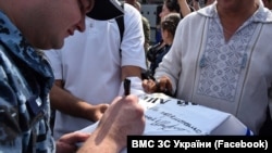 В Одесі командування Військово-морських сил України, екіпажі військових кораблів, волонтери, громадські працівники і родичі зустрічали звільнених українських моряків.