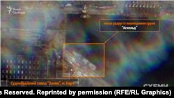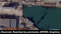 На знімках Planet Labs за 5 листопада, які є у розпорядженні журналістів проєкту Радіо Свобода «Схеми», помітно місце ураження на суднобудівному заводі у Керчі та військове судно, яке також виглядає пошкодженим.