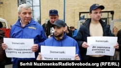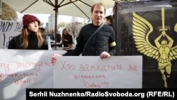 Неподалік активістів із плакатами стоять також люди із символікою ВО «Свобода», передає кореспондент Радіо Свобода.