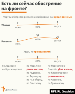 Возможно, эскалация в начале июля связана с годовщиной освобождения городов севера Донецкой области от оккупации. А на последнюю неделю августа выпали празднования Дня государственного флага и тридцатого юбилея Независимости Украины. К тому же, на 31 августа планировалась встреча Владимира Зеленского и Джозефа Байдена.