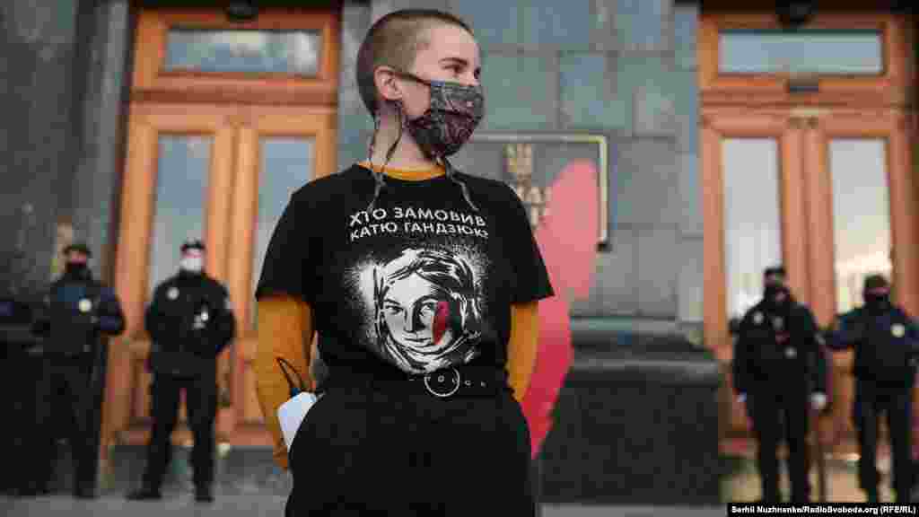 Декілька десятків людей, активістів ініціативи «Хто замовив Катю Гандзюк?» під Офісом президента України влаштували акцію протесту, учасники акції вимагали пояснень від Володимира Зеленського та звільнення генпрокурора Ірини Венедіктової через завершення досудового слідства у справі Катерини Гандзюк.