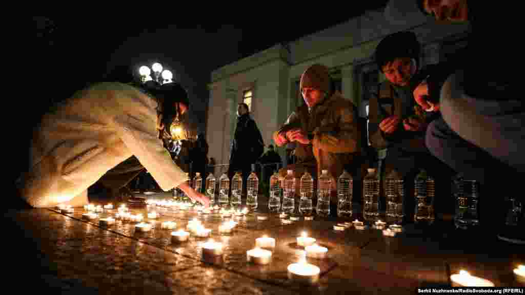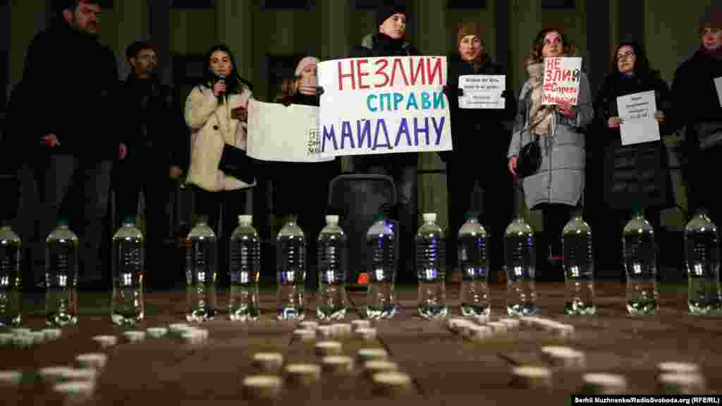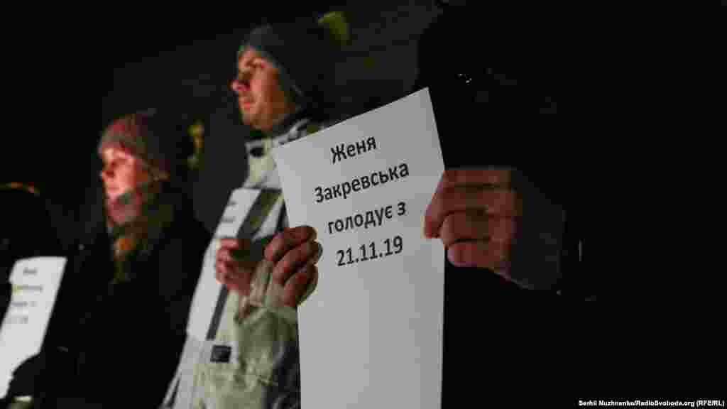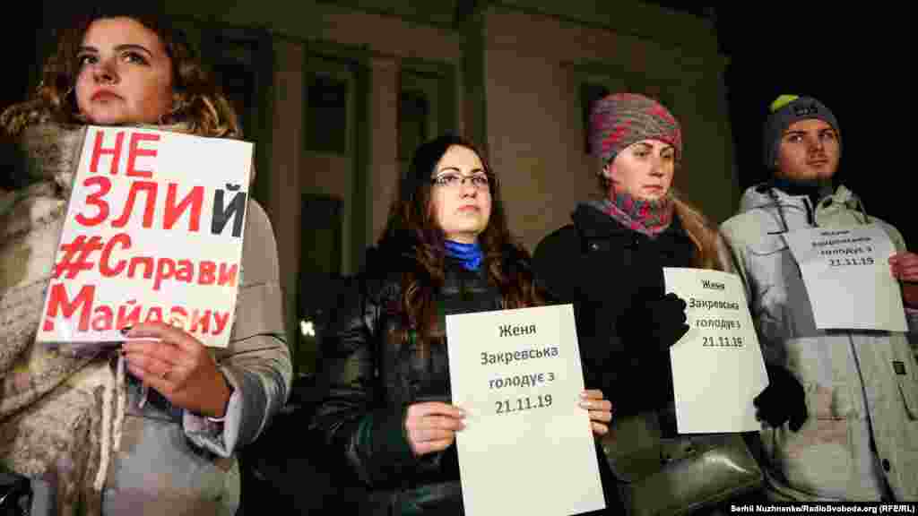 Під стінами парламенту в Києві пройшла акція на підтримку адвокатки родин Небесної сотні Євгенії Закревської, яка оголосила голодування через нерозслідування справ Майдану. На акцію вийшло декілька десятків людей, вони поставили пляшки з водою, а також зі свічок виклали напис «Не злий Майдан».