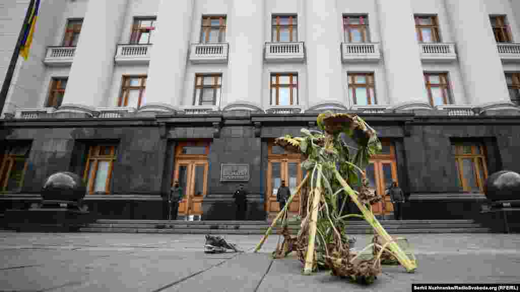 До паркану посольства учасники акції прикріпили старі кросівки зі слідами «крові», а також пожовклі соняшники – як ті, серед яких гинули українські військові, як нагадування про злочин Російської Федерації.