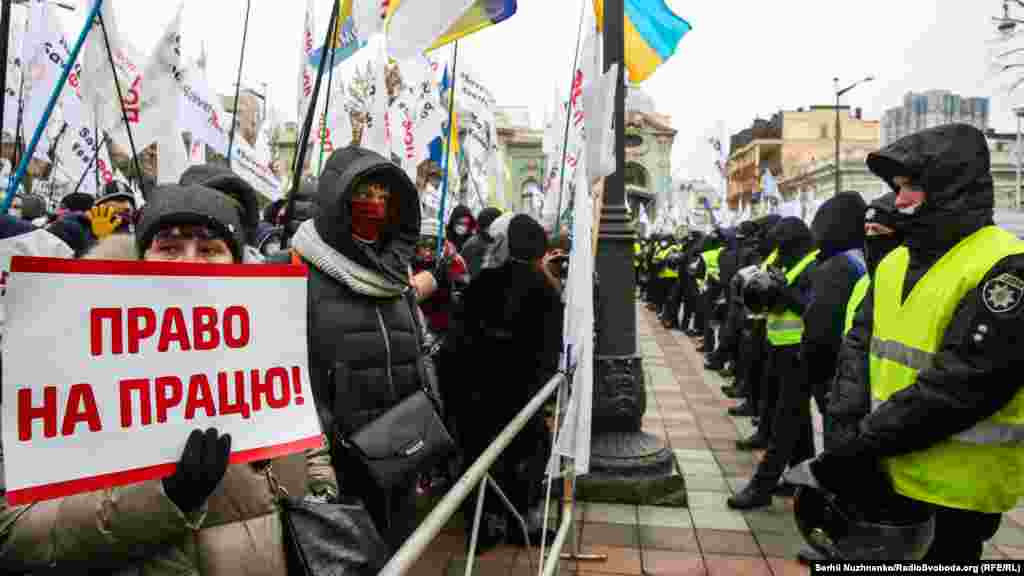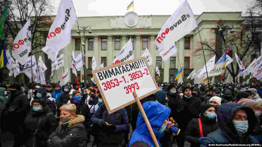 17 листопада біля будівлі Верховної Ради відбувається акція підприємців «Право на працю!». Близько тисячі її учасників вимагали скасувати карантинні обмеження для малого бізнесу та ухвалити законопроєкти, спрямовані на захист спрощеної системи оподаткування.