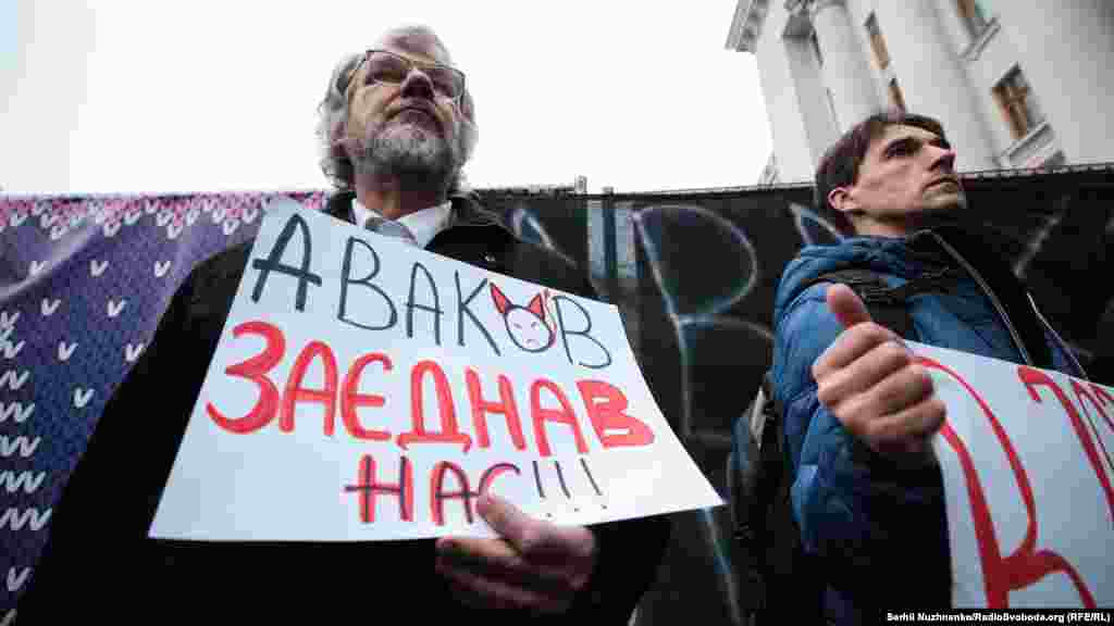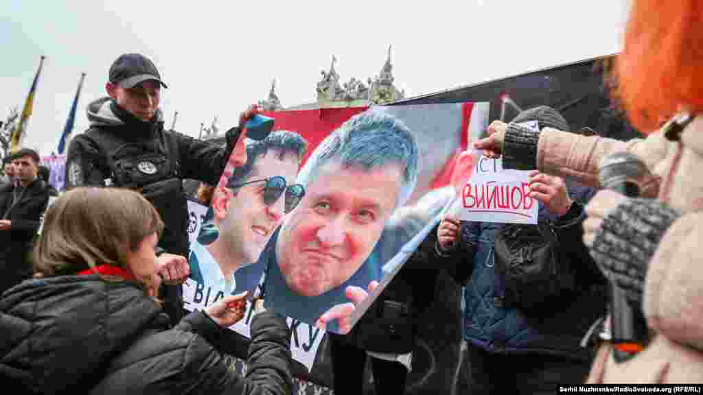 Декілька десятків активістів зібралися під Офісом президента з плакатами «Аваков чорт», «Тимчасовий міністр – час вийшов», «Авакова у відставку».