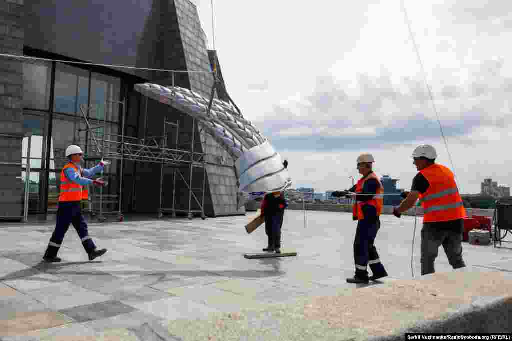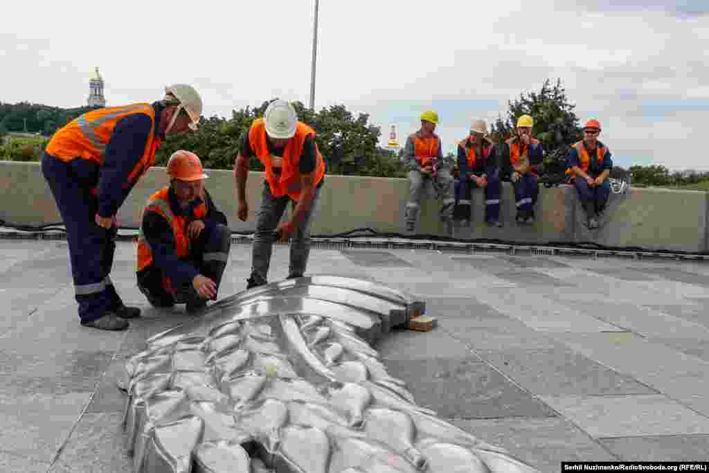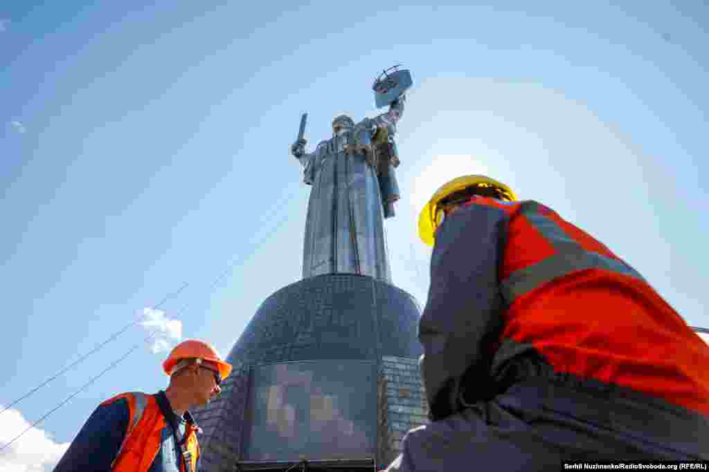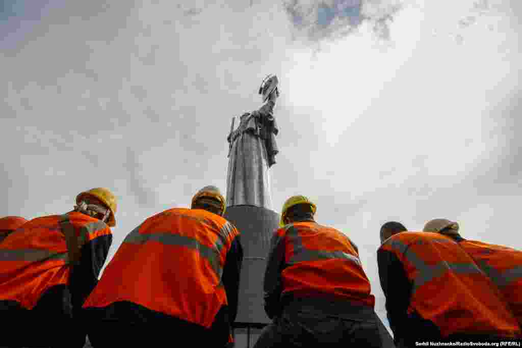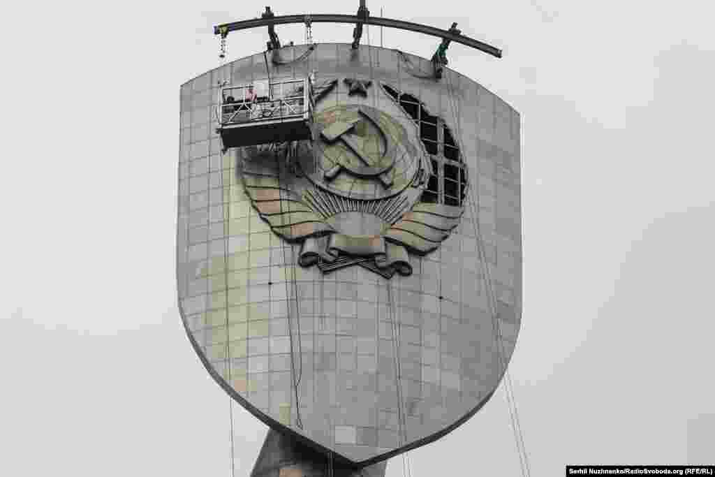 «Батьківщина-мати» без серпа та молота: у Києві розпочали демонтаж герба СРСР із монумента (фоторепортаж)