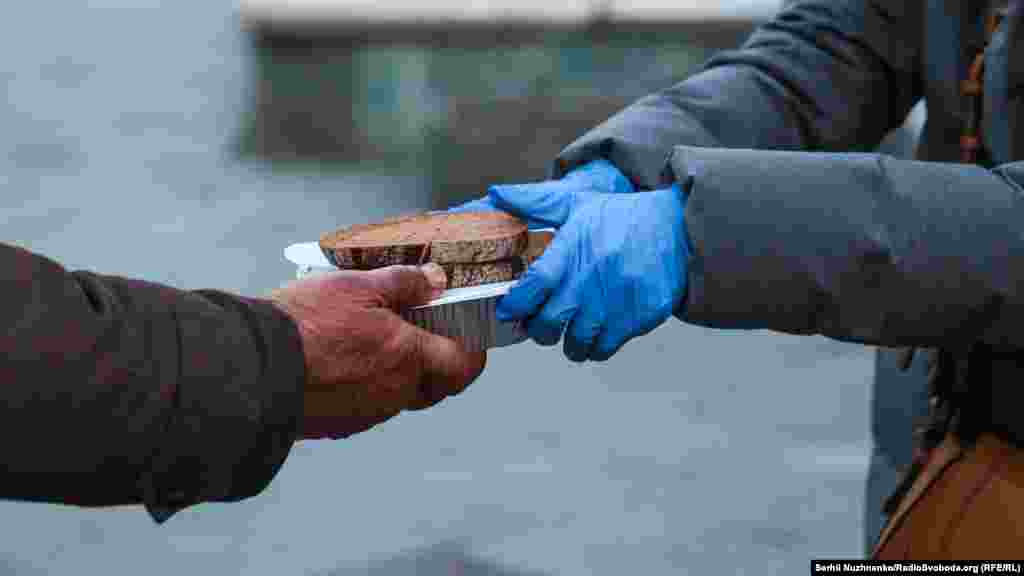 У Києві, в центрі міста, благодійники продовжують безкоштовно роздавати їжу безпритульним людям. В умовах карантину змінилася як і процедура роздачі, так і ситуація із самими безхатьками. Якщо раніше, кажуть благодійники, до них приходили як і безпритульні, так і пенсіонери, яким бракувало коштів на харчі, то нині останні перебувають вдома, адже в громадському транспорті в умовах карантину діють обмеження.