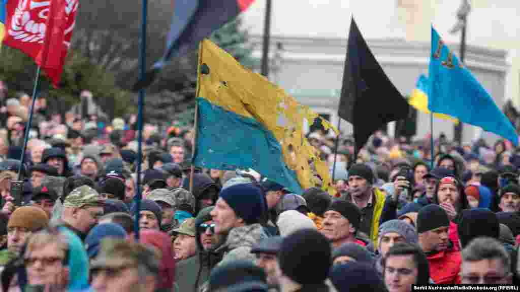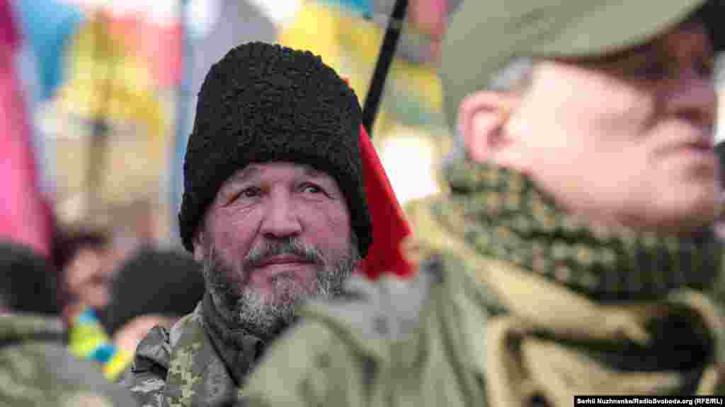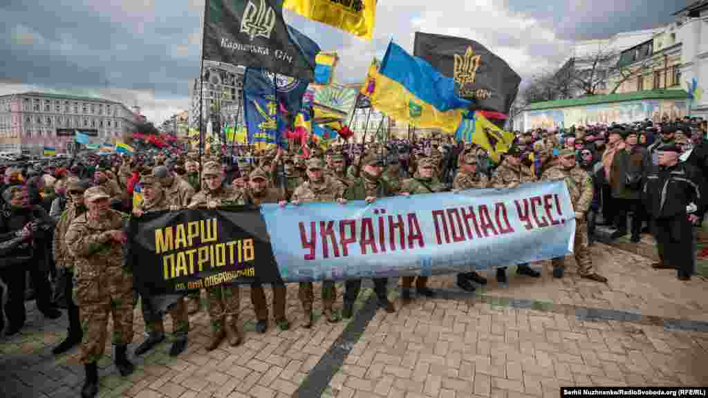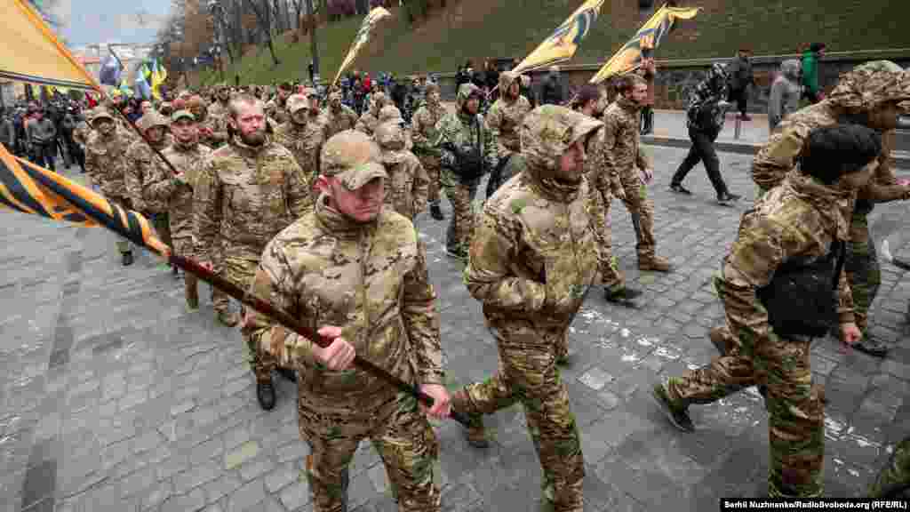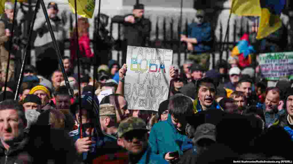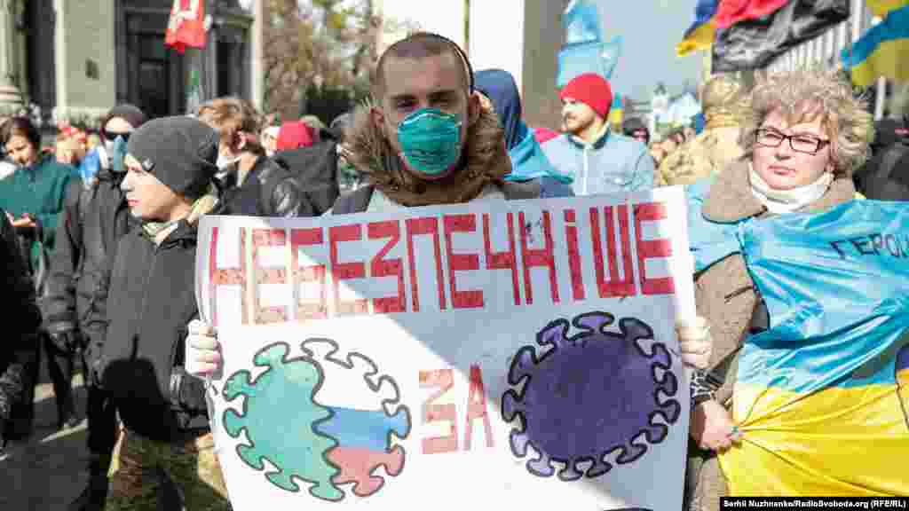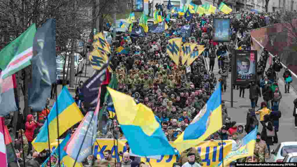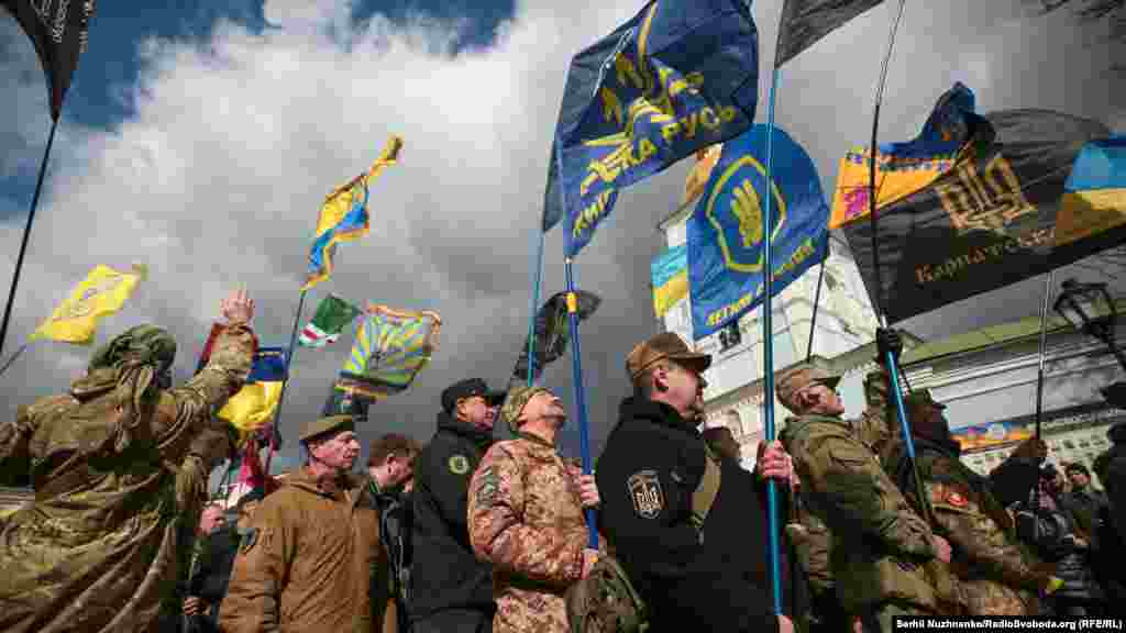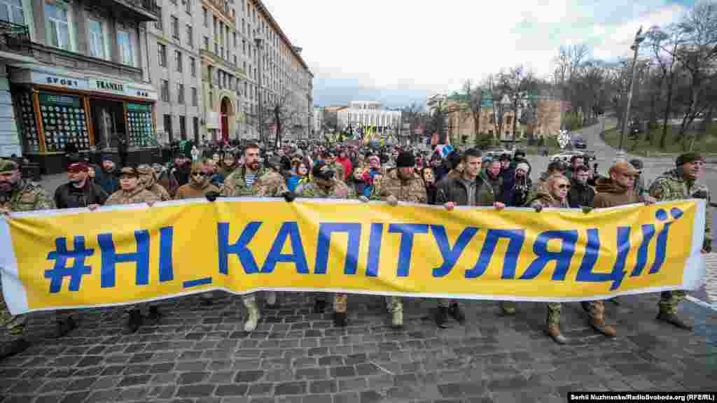Кілька тисяч людей зібралися у центрі столиці України 14 березня з нагоди Дня українського добровольця. Вони рушили від Михайлівської площі до урядового кварталу, де вигукували «Зелю геть», «Ні капітуляції», «Слава добровольцям». Під стінами Офісу президента України, учасники маршу озвучили свої вимоги. Серед них: припинити, за їхніми словами, переговори щодо легалізації контрольованих Росією угруповань «ЛДНР». 13 березня голова Офісу президента України Андрій Єрмак повідомив на брифінгу РНБО, що Тристороння контактна група в Мінську планує створення так званої «консультативної ради» для обговорення питань, передбачених у пакеті Мінських домовленостей.