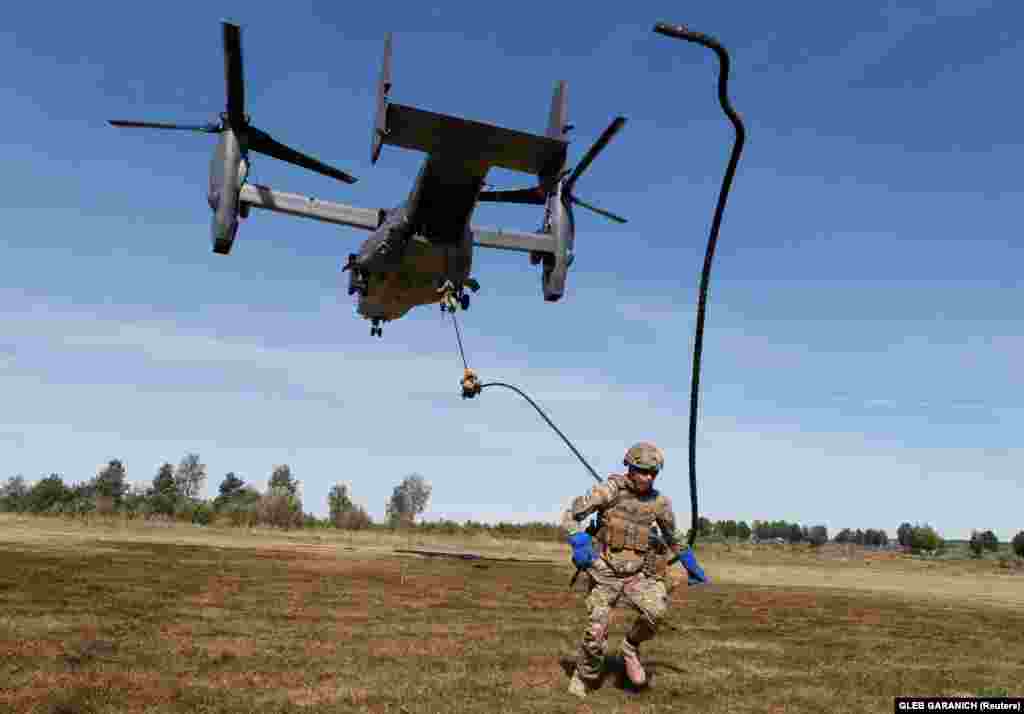 радників і спостерігачів від США, Великої Британії, Німеччини, Литви та Польщі, а також понад 100 військових частин та підрозділів усіх видів військ Збройних сил, близько 12 тисяч людей та 700 одиниць техніки. Одночасно з ними відбуваються на Яворівському полігоні у Львівській області навчання Rapid Trident-2020. ЗСУ, військові США, Німеччини, Данії, Румунії, Литви, Польщі, Канади та Великої Британії – загалом близько 4000 осіб – взяли участь у цих тренуваннях. Залучені конвертоплани США, колісна та гусенична військова техніка, армійська авіація Сухопутних військ та авіація Повітряних сил України. (Фото: Офіс президента, Reuters, RFE/RL: Сергій Нужненко).