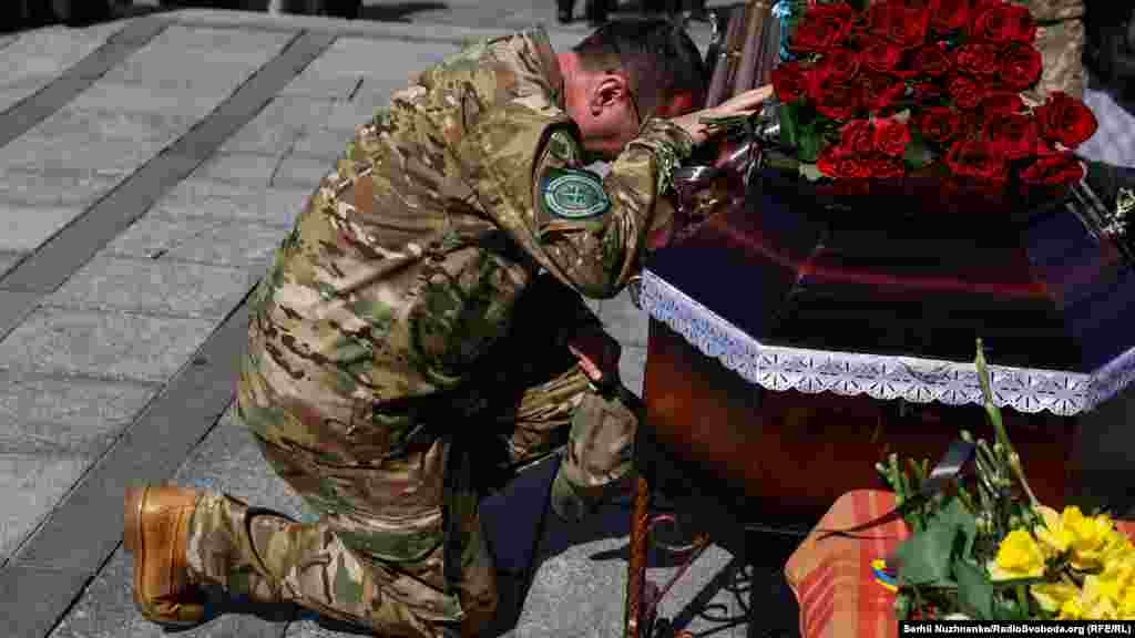Боєць Сил територіальної оборони ЗСУ Юрій Мороз загинув у Донецькій області 16 квітня. А 24 квітня на майдані Незалежності в Києві провели церемонію прощання із військовим: ця традиція з'явилася під час Революції гідності, активним учасником якої він був. Попрощатися з Юрієм прийшли його бойові товариші, близькі та знайомі, а в останню путь загиблого бійця проводжали на колінах. Поховали бійця в смт Борова Київської області.
