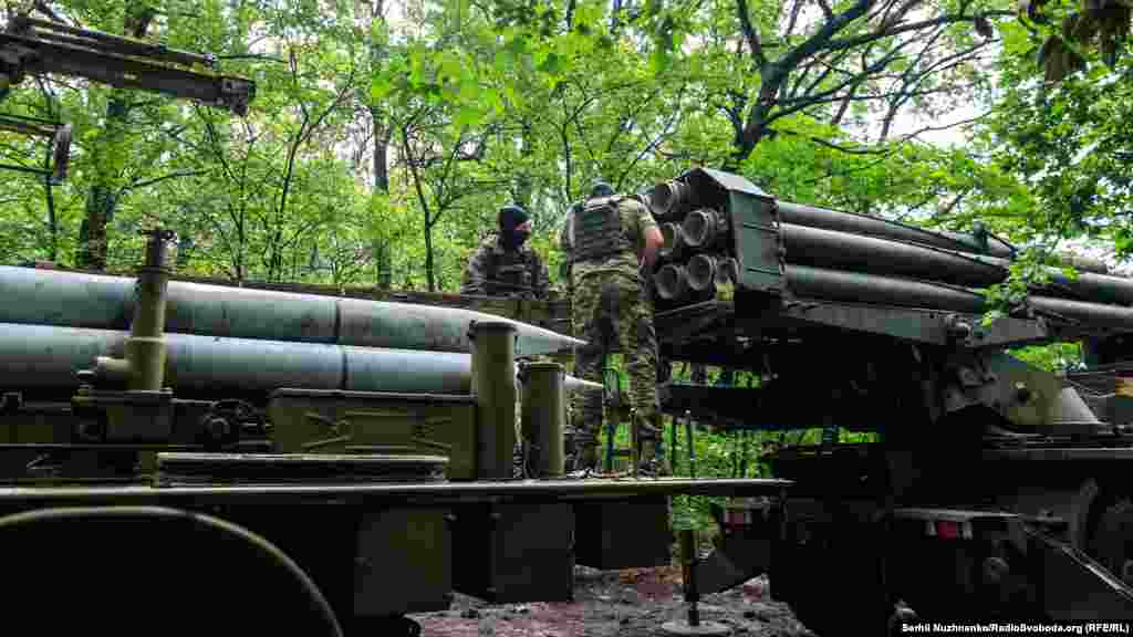 Українські військові заряджають реактивну систему залпового вогню «Буревій» на позиції в Харківській області, серпень 2022 року