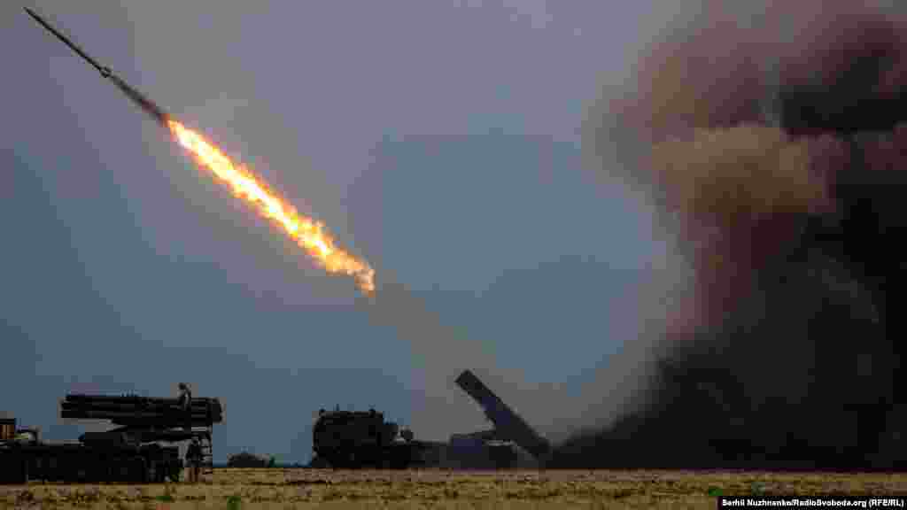 Підрозділи української реактивної артилерії наносять вогневе ураження по противнику з реактивної системи залпового вогню «Буревій». Харківщина, серпень 2022 року