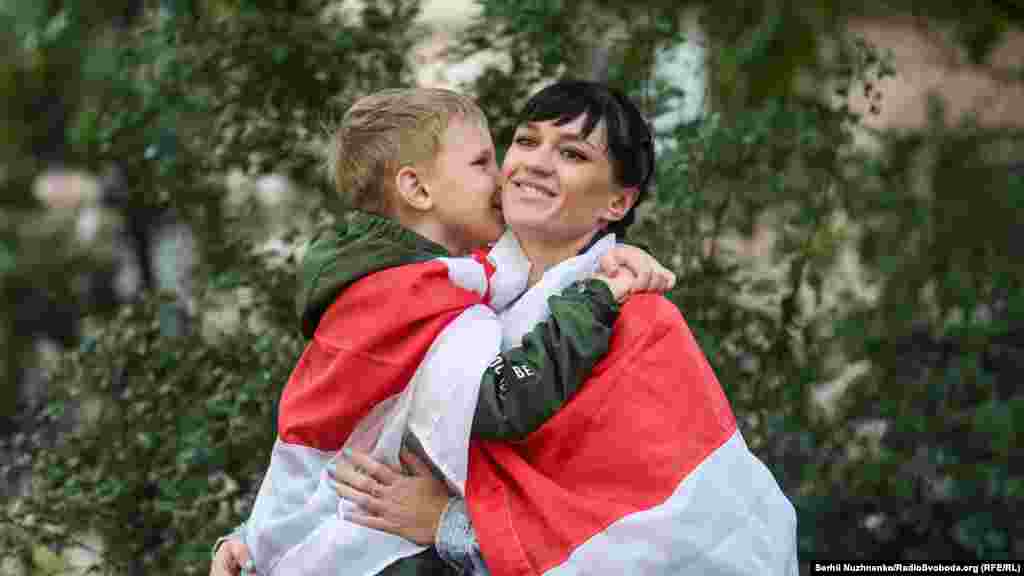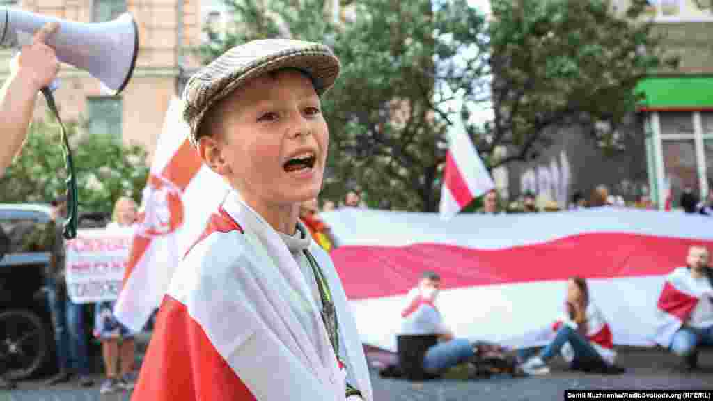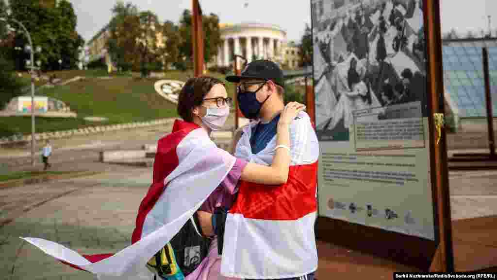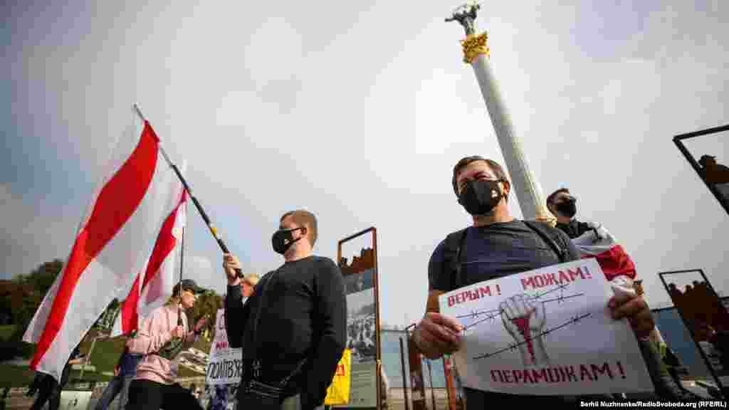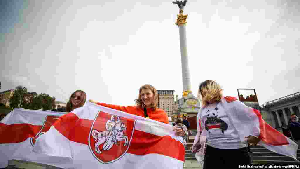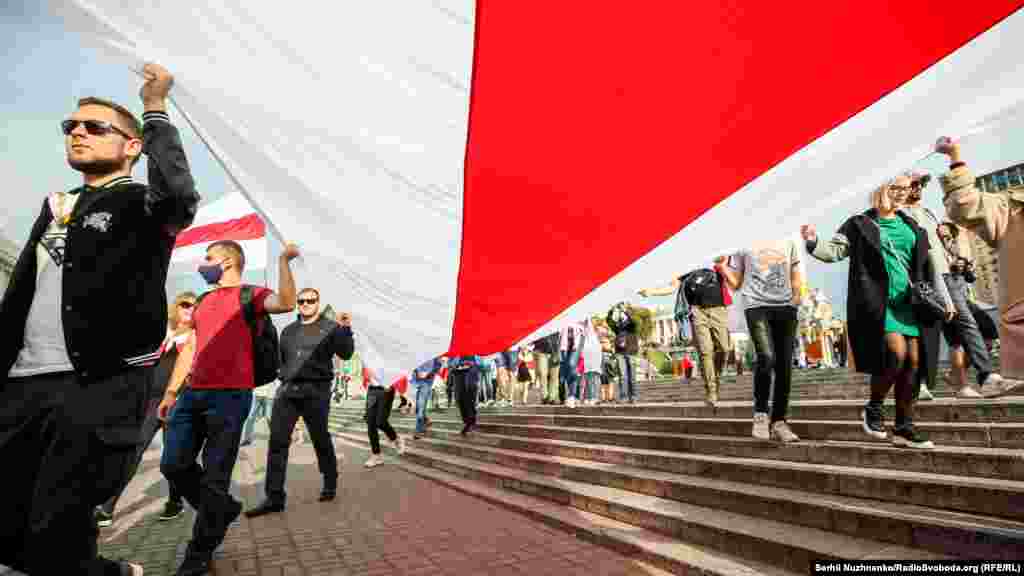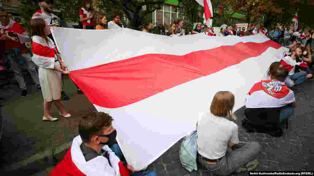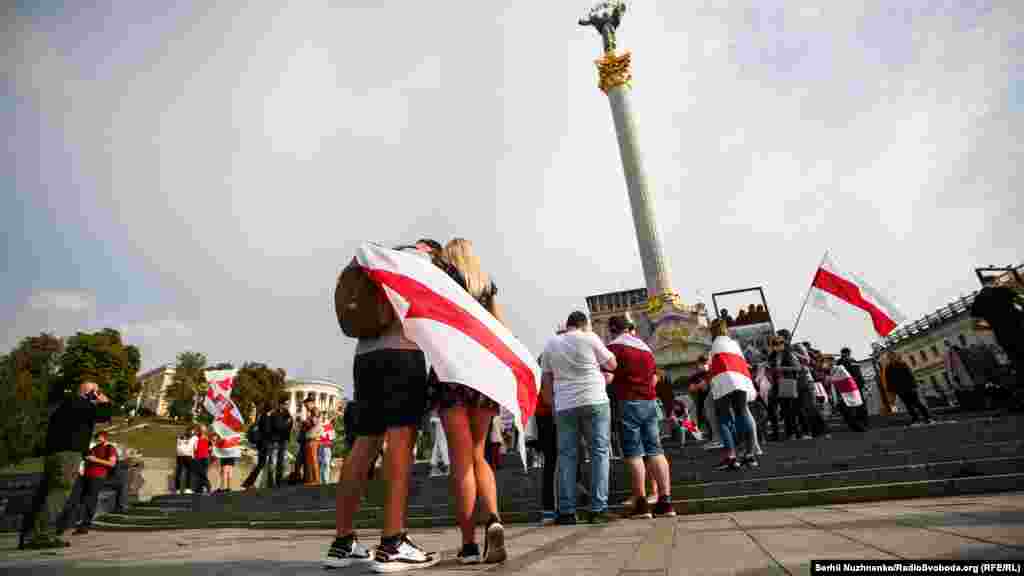 Близько сотні людей зібралися 4 жовтня на майдані Незалежності в Києві. З біло-червоно-білими прапорами вони пройшли від майдану центром міста до будівлі посольства Білорусі. Учасники акції скандували: «Живе Білорусь!», «Сашу в автозак» та інші гасла.