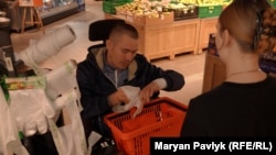 Ерготерапевт Марія Кошеленко просить Дмитра самостійно викликати у супермаркеті ліфт, взяти кошик для продуктів.