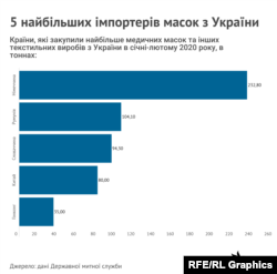 Україна експортувала близько 640 тонн медичних масок у січні-лютому 2020 року, повідомила Державна митна служба України у відповідь на запит Радіо Свобода. Загальна вартість проданих масок становила майже 13 мільйонів доларів.