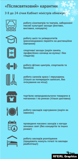 Крім того, із 8 січня 2021 року в Україні знову почнеться карантин – щоправда, не такий жорсткий, як навесні. Відповідне рішення ухвалив Кабінет міністрів цього тижня. Які заклади не зможуть працювати на повну після свят і що уряд пропонує бізнесу натомість – у матеріалі Радіо Свобода.