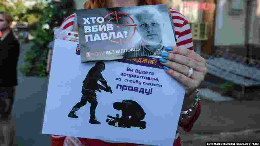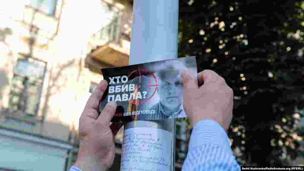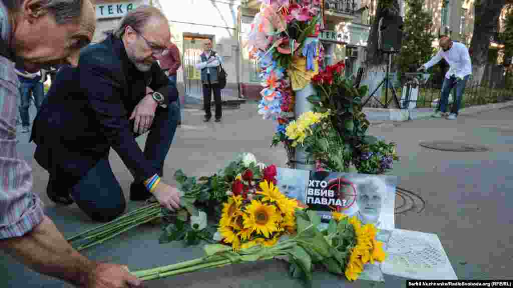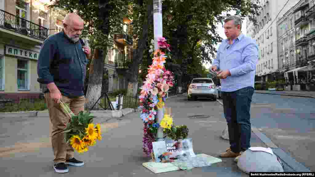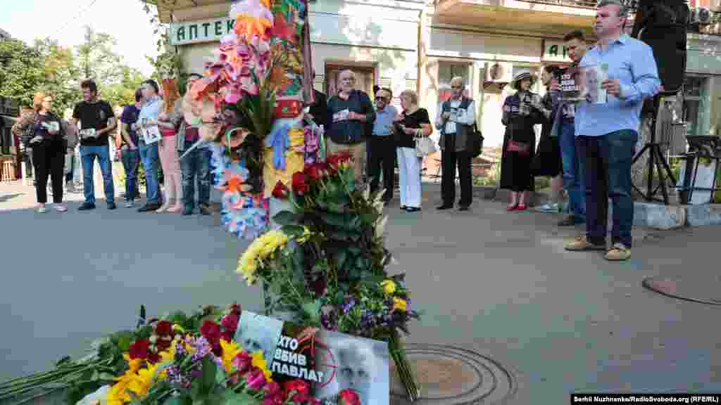 На місці загибелі журналіста Павла Шеремета на перехресті вулиць Івана Франка та Богдана Хмельницького у Києві в суботу відбулася акція пам’яті, на яку зібралися десятки журналістів.