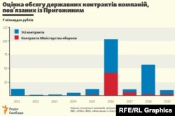 Компанії, які можна пов’язати з російським олігархом Євгеном Пригожиним, здобули з 2011 року принаймні 5 тисяч 393 державні контракти на суму понад 209 мільярдів рублів (близько 3,2 мільярда доларів США), свідчить розслідування проекту Радіо Свобода «Настоящее время», що здійснюється з участю «Голосу Америки», спільно з російським антикорупційним сайтом «Муніципальний сканер».
