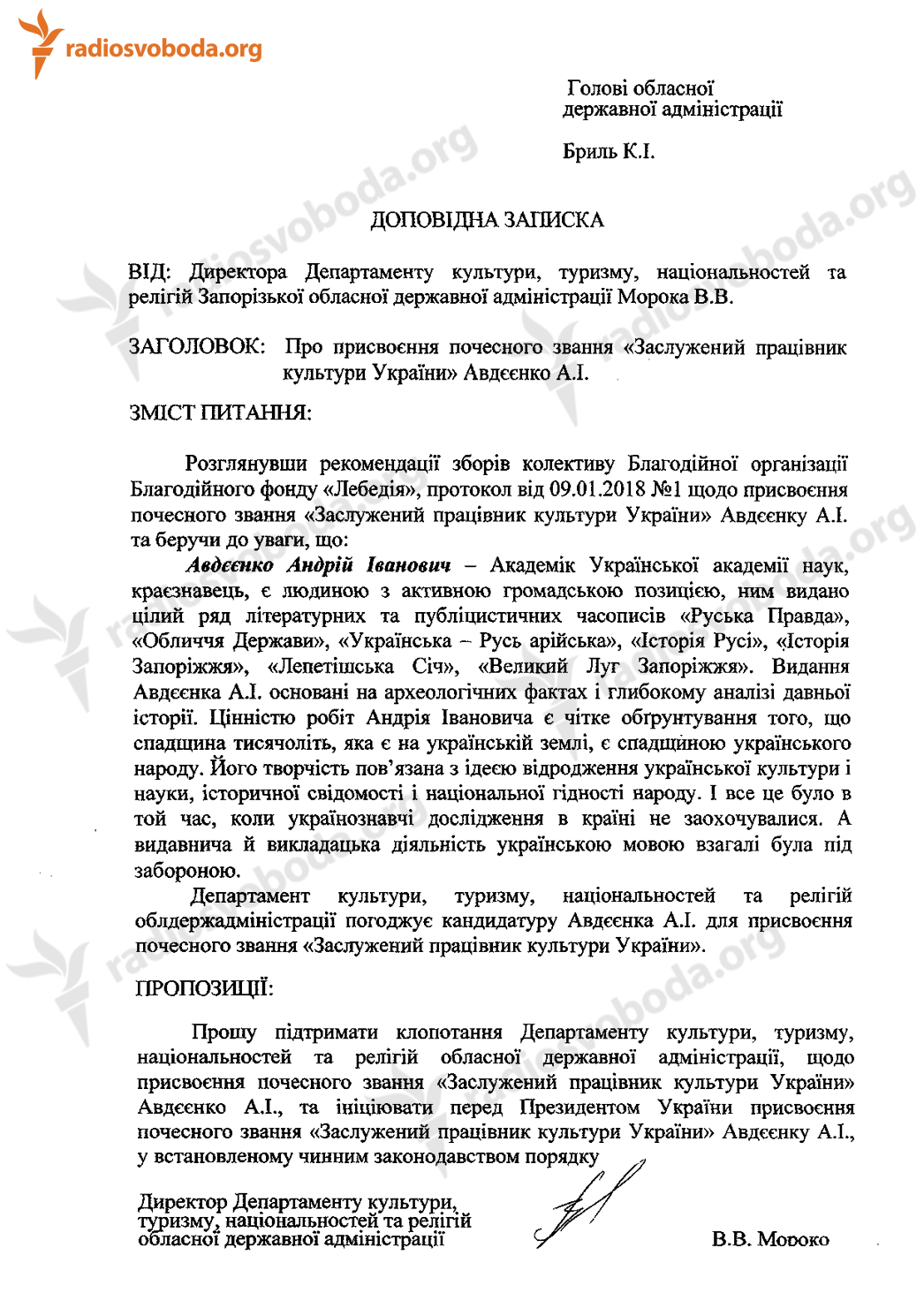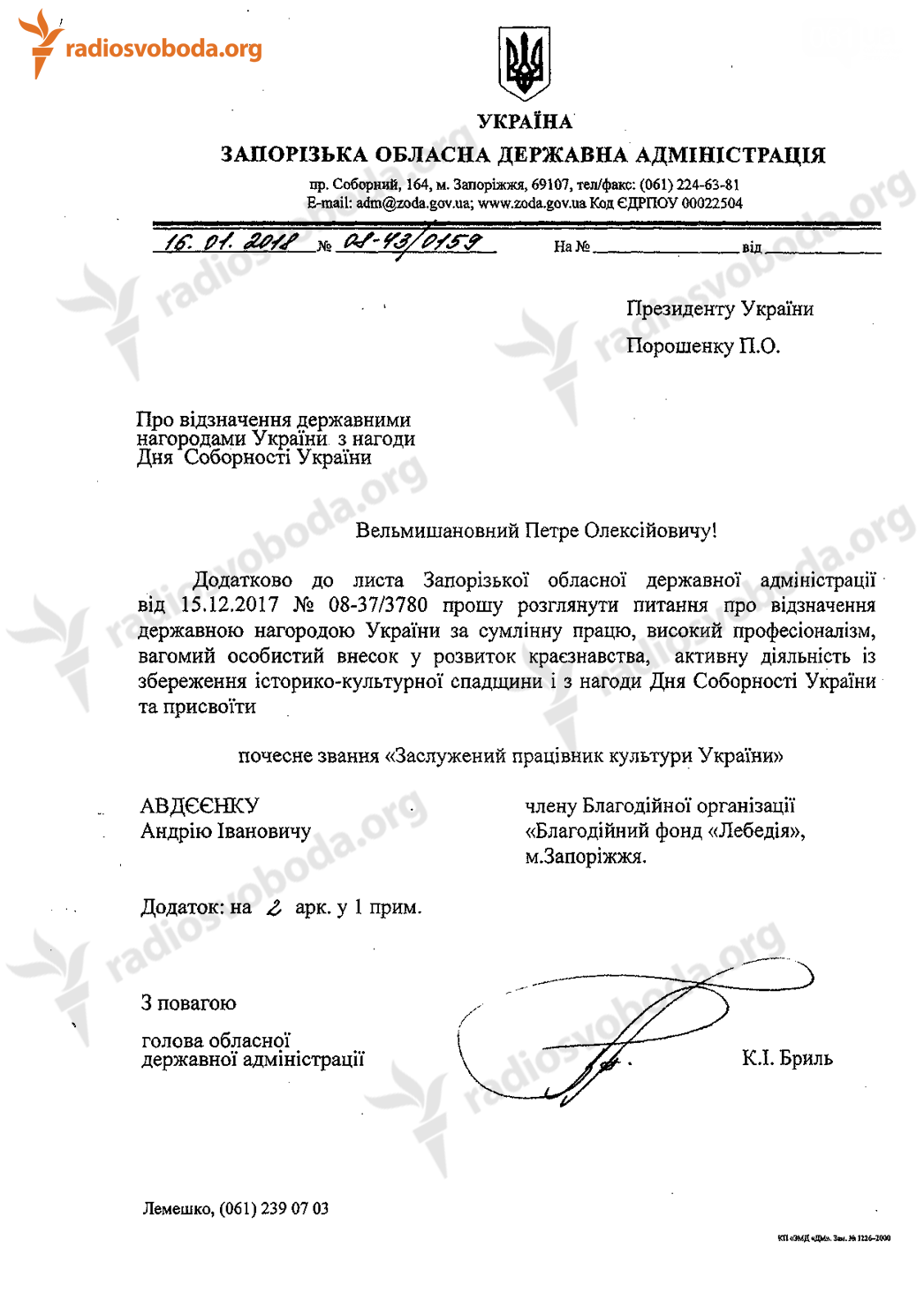 Отож клопотання голови Запорізької адміністрації Бриля нагородити Авдєєнка потрапило до Адміністрації президента.