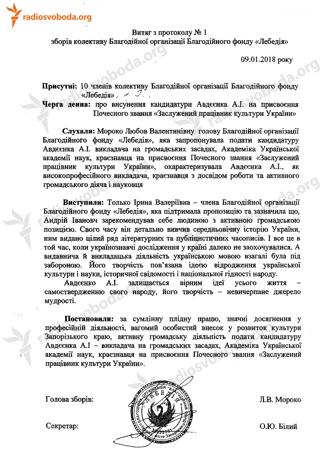 Кандидатуру Авдєєнка на присвоєння почесного звання «Заслужений працівник культури» подавав благодійний фонд «Лебедія», членом якого є Авдєєнко. Співзасновниця та голова цього фонду – Любов Мороко. Далі протокол зборів за її підписом надіслали її чоловікові Владиславу Мороко, який обіймає посаду директора департаменту культури Запорізької обласної державної адміністрації. Так це клопотання про нагороду потрапило на стіл очільнику Запорізької області Костянтину Брилю, який і перенаправив його вже від свого імені самому президенту.