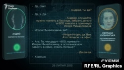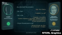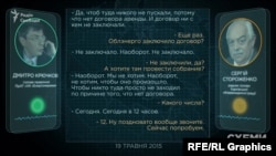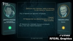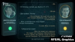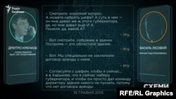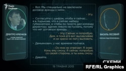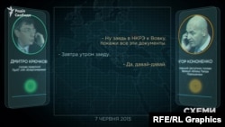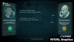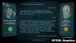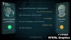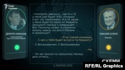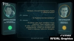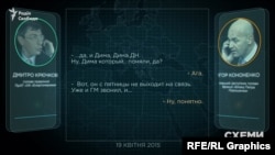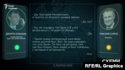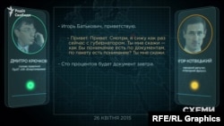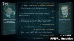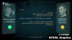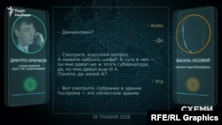 «Схемам» вдалося отримати записи телефонних розмов бізнесмена Дмитра Крючкова, завдяки яким можна почути відповіді на ці питання. Події охоплюють період весни-літа 2015 року, коли остаточно формується вертикаль влади після революційних подій – а різні напрямки закріплюються за конкретними кураторами та виконавцями. Експертиза довела високу вірогідність, що голоси співрозмовників є справжніми.