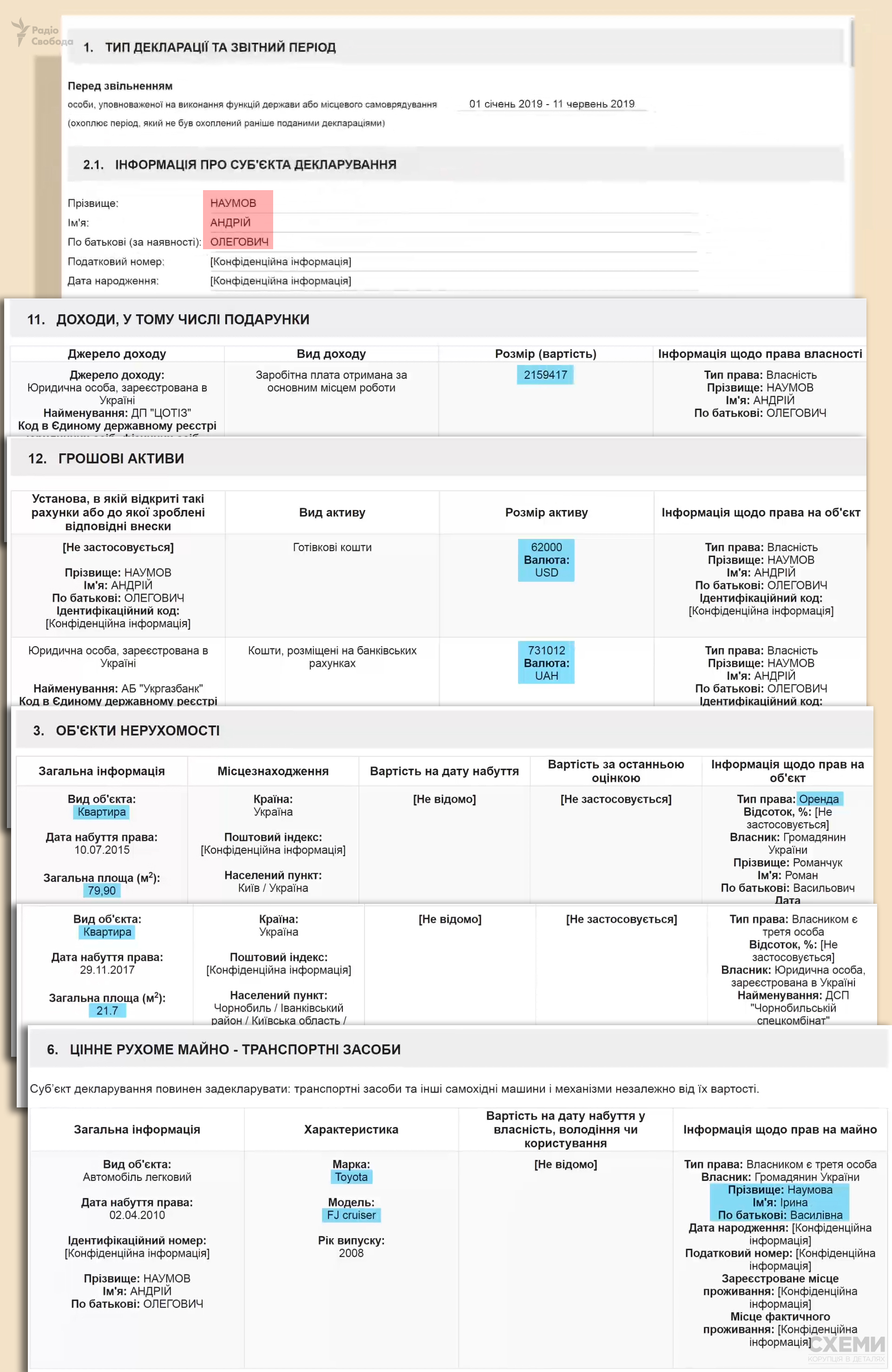 Остання декларація Наумова, яку можна знайти, – за 2019 рік, подана перед звільненням з роботи в Чорнобильській зоні. Згідно з якою, він не має власної нерухомості. А от у його родини ситуація дещо краща.
