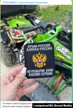 Кримчанка Петрусевич також збирає колекцію патчів, в її колекції є шеврон «Все – Росія, крім Косова, Косово – Сербія».