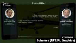 У телефонних розмовах Богуслаєв визнає, що розвідники мають на це право. Примусове відчуження або вилучення майна з приватної власності для потреб держави прописане у законі «Про правовий режим воєнного стану».