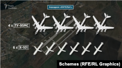 Як йдеться у розслідуванні, місцем базування цих стратегічних бомбардувальників є аеродром «Енгельс» в Росії. «Схеми» отримали доступ до супутникових знімків за 28 квітня 2022 року, на якому помітні десятки бортів Ту-95МС та Ту-160, які є носіями Х-101.