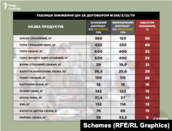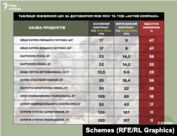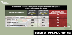 Так, в публічному просторі скандал із закупівлею харчів у ТОВ «Актив Компані» звівся переважно до яєць. Хоча насправді, як показав аналіз «Схем», в цьому контракті були завищені ціни і на низку інших «ходових» продуктів, як-то: картопля, вода, буряк, капуста, олія, курятина, морква. Ілюструє це – порівняльна таблиця, на які товари були знижені ціни найбільше.