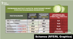 Ще один овоч, який становить вагому частину раціону для війська і закуповується у великих обсягах – це капуста. Здебільшого – звичайна, білоголова. Фірма «Актив Компані» за оновленим контрактом продаватиме її за 22 гривні. При цьому, «Схеми» виявили, що протягом грудня-січня закуповувала цей товар ця фірма.. майже втричі дешевше, по 8,5 гривень за кіло.