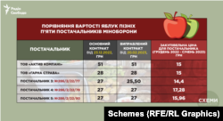 Порівняно з «Актив Компані» їхні бюджетні апетити на порядок скромніші. Вони закуповують яблука також по 15-16 гривень за кілограм. Але перепродають їх армії «всього» вдвічі дорожче.