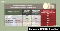 В контрактах інших чотирьох постачальників ціна на яйця не змінилась. В грудневому контракті вони коштували від 8 до 9 грн, в оновлених додатках ціна та сама.