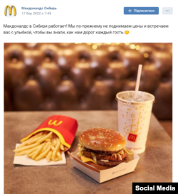 17 березня в регіональній мережі закладів повідомили, що будуть продовжувати роботу в Сибіру. «McDonald’s у Сибіру працює! Ми, як і раніше, не піднімаємо ціни і зустрічаємо вас з усмішкою, щоб ви знали, як нам дорогий кожен гість», – повідомила компанія в соціальній мережі «ВКонтакте».