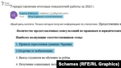 У звіті Бакланова за 2022 рік для російського «Правфонду» вказана кількість консультацій – 309 за рік. Серед зазначених тем – «правила перетину кордону» та «відстрочка від мобілізації».
