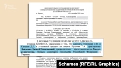 Є інший документ – угода Новицької з обвинуваченою Кузьміч. Тут згадка, що адвокатку запросила Лідія Дьяченко – перша секретарка російського посольства в Україні, представниця «Россотрудничества».