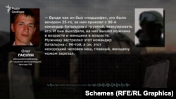 «Нібито він був напідпитку, це було ввечері 25-го, за ним приїхав з 96-ї командир батальйону з групою, евакуювати його. Вони виходили, на них вийшли літні чоловік та жінка. Чоловіка застрелив цей командир батальйону з 96-ї, а він, ця нехороша людина наша – головний – жінку ножем зарізав», – розповідає Гасілін.