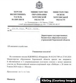 Серед них журналісти побачили звернення так званої міністерки освіти окупаційної влади Людмили Ковтун до директорів шкіл. Посилаючись на лист від «Юнармії», вона просить їх визначити та направити учасників та супроводжуючих для поїздки в Москву на всеросійську воєнно-спортивну гру «Победа».
