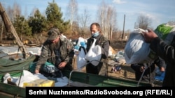 Поки спілкуємося із Віталієм, з-за наших спин виїжджають іще дві автівки. Без зайвих розмов чоловіки беруться усе вивантажувати й розкладати біля тієї ж вцілілої хати.
