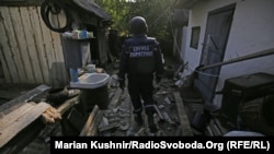 «Нам дали працівника поліції, тут, знаєте, дільничих не вистачить», – каже нам здалека співробітник ДСНС. Якщо в будинку господарів немає, то «надзвичайників» супроводжують правоохоронці – такий порядок. Дві-три хати – по рації групу викликають на вулицю Гагаріна – є підозри, що один із снарядів «зарився» у землю. Група в бронежилетах виїхала на місце.